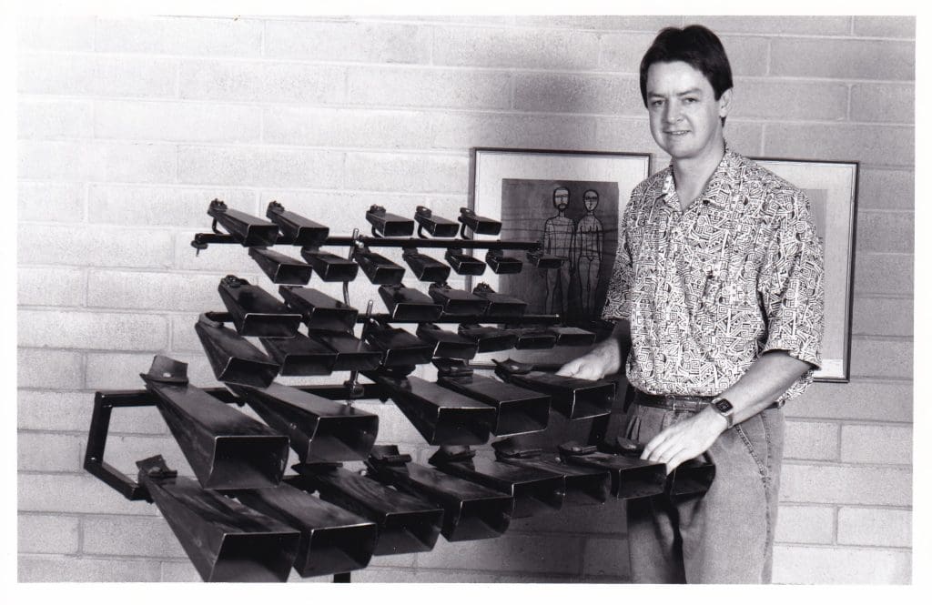 Omphalo Centric Lecture by Westlake, Third Construction by Cage, Et Expecto Ressurectionem Mortuorum by Messiaen. For this production three chromatic octaves of tuned cowbells (cencerros) were crafted by Chris Murdoch. Chris Murdoch also the crafted Log Drums used in Omphalo Centric Lecture.